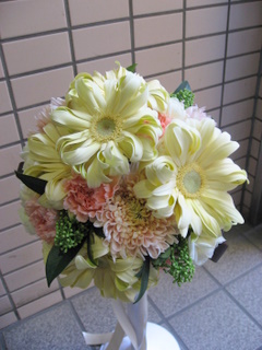 大輪ガーベラのパスタというお花や大きいマム(菊)をつかったブーケです。