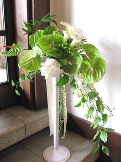 花材はアンスやカラー、あじさい、グリーンネックレス、りきゅうそう、らん、などです。