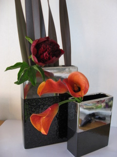 ブラック&シルバーのモダンな器に赤のシャクヤクやカラーをいれてみました。