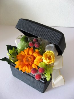 います。今回は元気な色、オレンジのガーベラでプリザーブドのボックスアレンジ