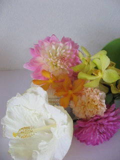 バリ風アレンジということで華やかだけどかわいらしくもあるモカラ(ラン)と大きなダリアを
